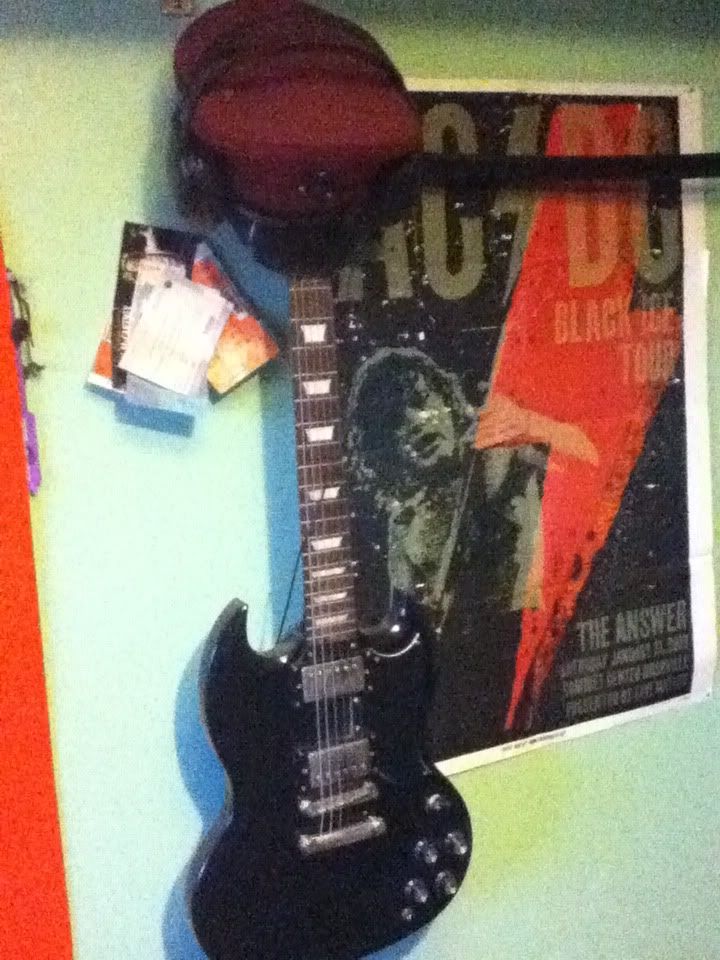I also have an Epiphone SG (poor as fuck), a Fender strat' (beta as fuck) and a really crappy Les Paul rip off my dad got me when I was little. I could fit my thumb in the action of that, ugh. Oh, and my mandolin which appears to have been assaulted by an axe wielding Norwegian. Which makes it bad ass and metal.