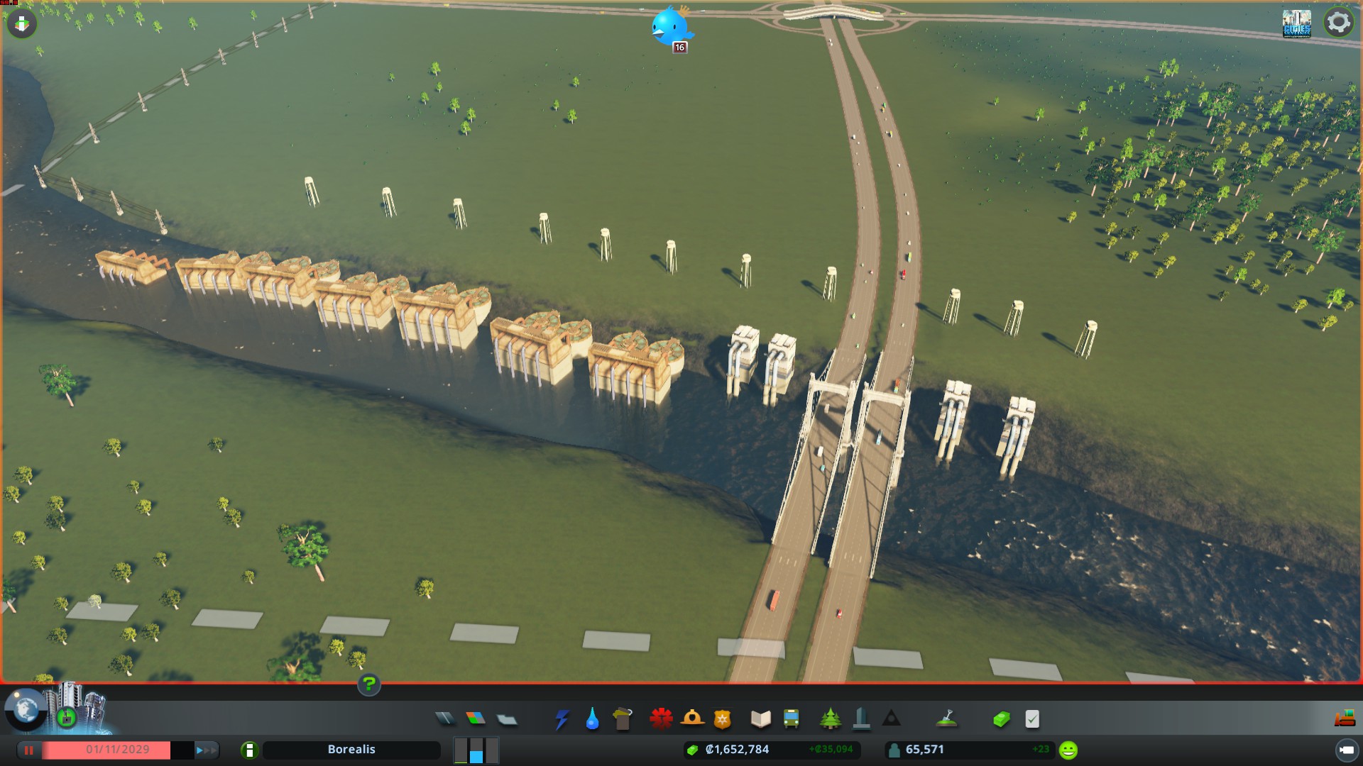 At one point I moved my water pumps from the main river here to one just north, out of the picture. Only I'd misjudged how much I was sucking up, and as the northern river was much smaller I completely dried it up.