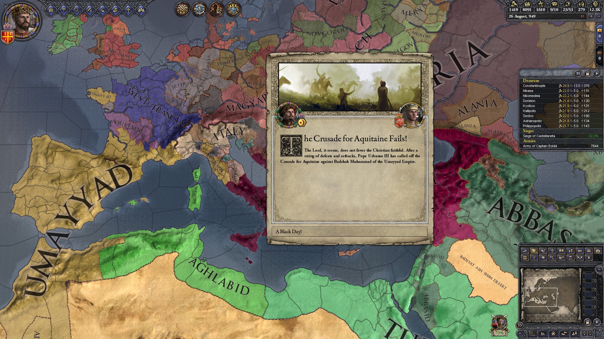 Some setbacks and a few nasty wars which killed a lot of my soldiers, as well as the re-establishment of the kingdoms of France and Aquitaine has made my expansion into that region a bit harder and slower, but ive still got large sections under my control in the north.