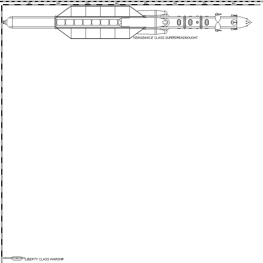 Ularn wrote:I've started work on a size chart for all the ships in my navy. Currently the only one pictured is the 851m long Vengeance class of Superdreadnoughts but I plan on eventually doing all nine of the classes in the Ularn Space Navy. At some point I also want to get them coloured as well but I'd like to have them drawn first. Also I need to so some work on the scale bars since they're not quite right yet but the scale is 1px=1m.