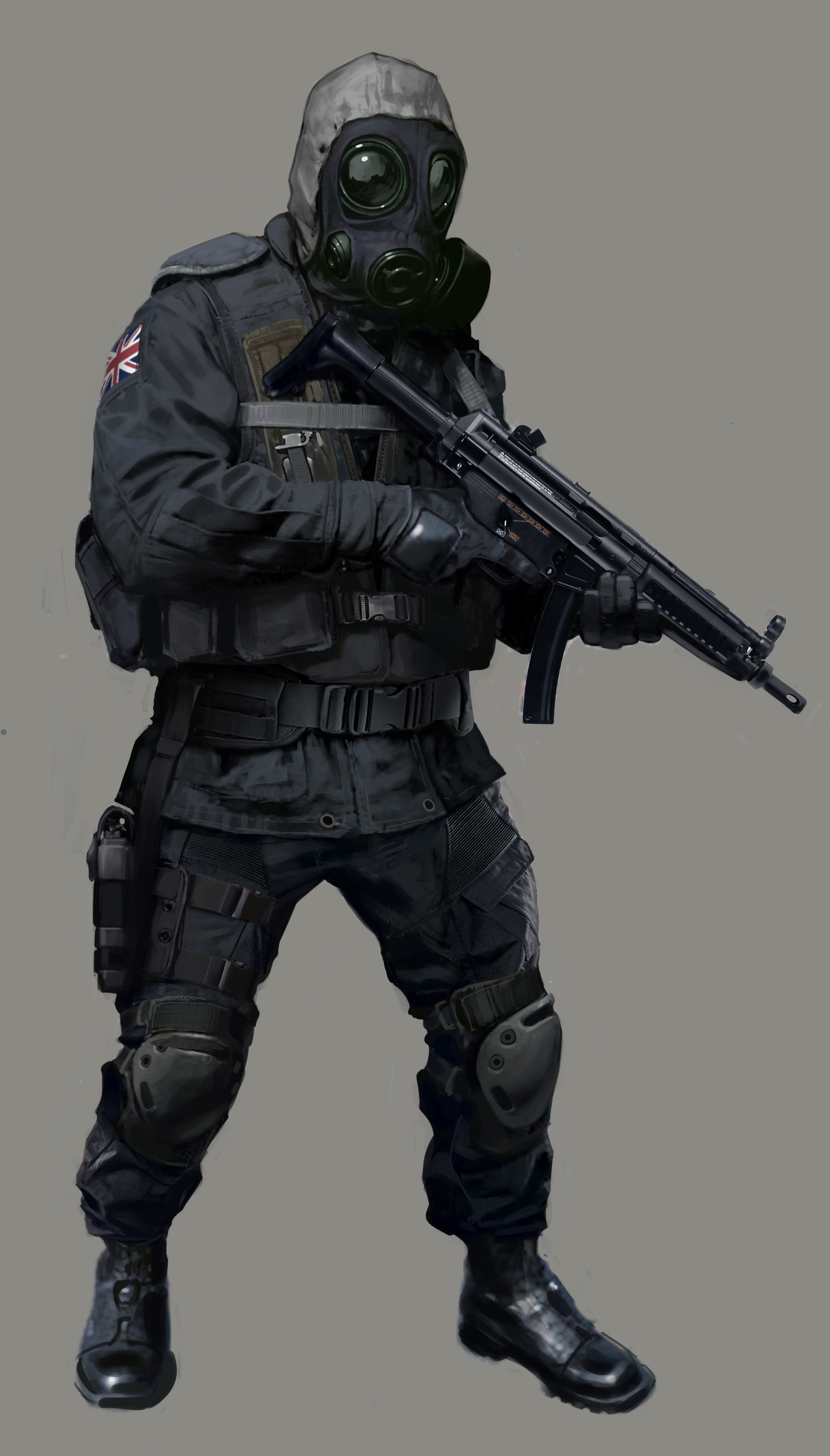 Equipment: High tech chromed suit of armor in the shape of a massive moustachio'd muscle man wearing a stahlhelm, wrist mounted SMGs, jumpjet boots, canisters that pump painkillers and air into his body.
